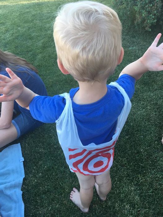 Christian came out to sit on the grass and join the other kids for a game of Pass the Parcel, only his shorts were already dirty and were tumbling in the dryer. So, Ben created this pair of overalls from a Target shopping bag for him to sit in: